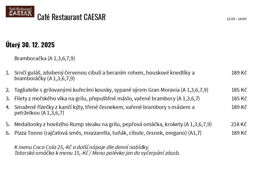 Děkujeme za Vaši návštěvu a přejeme Dobrou chuť! Teplá i studená jídla jsou určena k okamžité spotřebě. Informace o obsažených alergenech žádejte u obsluhy